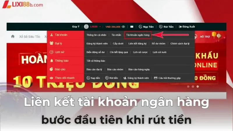 Sau khi đã liên kết thành công tài khoản ngân hàng, bạn có thể tiến hành rút tiền tại Lixi88 theo các bước đơn giản dưới đây.